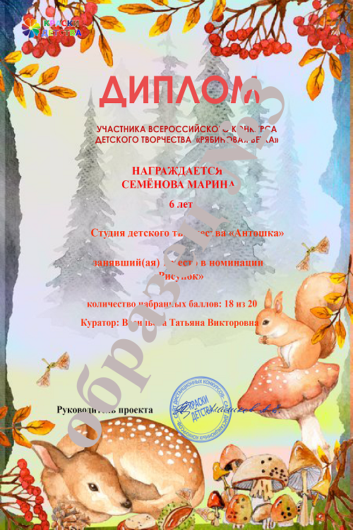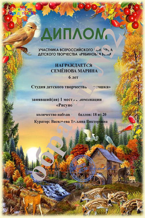 Когда смолкает пенье Е. Наумова Растет в наших лесах стройная красавица рябина. Издавна люди любовались ее красотой, называли ее кудрявой, посвящали ей стихи и воспевали в песнях. Она привлекает внимание в любое время года.Осенью рябинушка превращается в настоящую красавицу! Ажурно-кружевные листочки сперва светлеют, потом становятся желто-оранжевыми и красными. Среди них полыхают яркие сочные грозди спелых рябиновых ягод. И стоит рябинка нарядная, словно девушка в цветастом сарафане с рубиновым ожерельем на шее. С приходом зимы не теряет модница своей красоты. Она укрывает гибкие тонкие ветви пышными снежными шапками, из-под которых выглядывают алые серьги ягод. Весной на тонкоствольном деревце начинают распускаться изумрудные узорчато-кружевные листочки. Затем из бутончиков появляются маленькие белые цветочки, собранные в крупные пушистые шапочки. Их пряно-терпкий аромат можно почувствовать издалека. Летом рябиновые ягодки набирают силу, сначала светло-зеленые горошинки потихоньку желтеют, затем становятся светло-оранжевыми. Никто равнодушно не проходит мимо красавицы. Дети делают бусы из пунцовых ягодок. Хозяйки варят вкусное варенье. Птицы в студеные зимы спасаются от голода питательными плодами. Попробуйте и вы изобразить кудрявую красавицу в своем рисунке или поделке. Отправляйте свои работы на Всероссийский конкурс детского творчества "Рябиновая ветка". УЧАСТИЕ + ДИПЛОМ = 60 РУБЛЕЙ!! Образцы дипломов конкурса "Рябиновая ветка"(для увеличения наведите курсором на диплом)