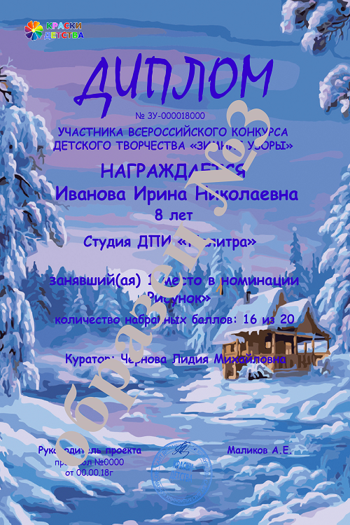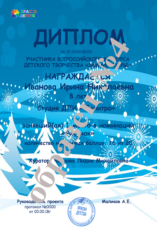 Разукрасилась зима:на уборе бахрома М. Пожарова Зима преобразила землю, расписала всё вокруг неповторимыми зимними узорами.Главный цвет-белый. Мягкий пушистый белый снег ровным слоем-покрывалом укрыл землю. Снег повсюду: на скамейках, на крышах домов, на деревьях. Деревья стоят важные, нарядные, словно в серебре. И только кое-где виднеются красные гроздья рябины. Под рябинами тонкие росчерки птичьих следов. Лишь городские улицы сбросили с себя снежный наряд, и кажется, что дорога черной змеей извивается между высокими домами в белоснежных шапках. Люди куда-то спешат, оставляя на снегу цепочки следов, которые причудливо переплелись между собой. Снег блестит на солнце, искрится и переливается. А как изящно расписала зима наши окна! В этих узорах можно легко угадать образы фантастических птиц и животных, таинственных существ, прекрасных цветов! Изобразите зиму в рисунках и поделках и участвуйте во Всероссийском конкурсе детского творчества "Зимние узоры". УЧАСТИЕ + ДИПЛОМ = 60 РУБЛЕЙ!! Образцы дипломов конкурса "Зимние узоры"(для увеличения наведите курсором на диплом)